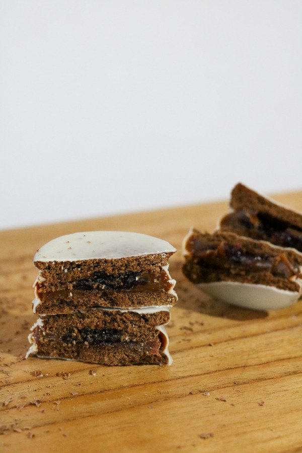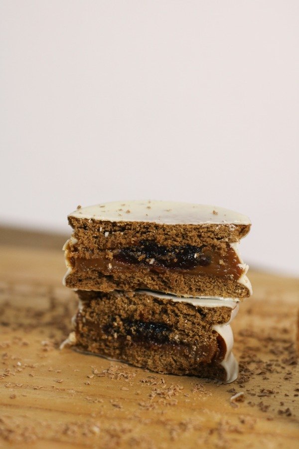 ALFAJOR DE CHOCOLATE RELLENO DE DULCE DE LECHE Y CORAZON DE FRUTOS DEL BOSQUE Y BAÑO DE REPOSTERÍA BLANCO